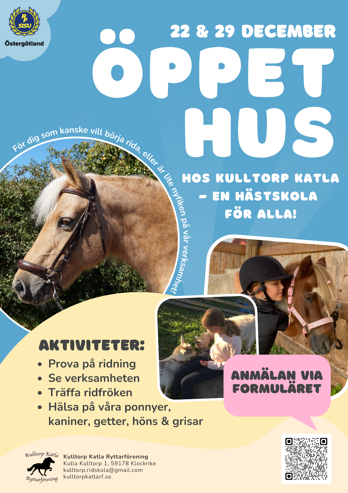 Den 22 och 29 december kl. 10–12 öppnar vi upp gården och bjuder in dig som är nyfiken på hästar, ridning eller vår verksamhet. Oavsett om du funderar på att börja rida, är förälder till ett barn som älskar djur eller bara vill se hur vi har det – varmt välkommen!
