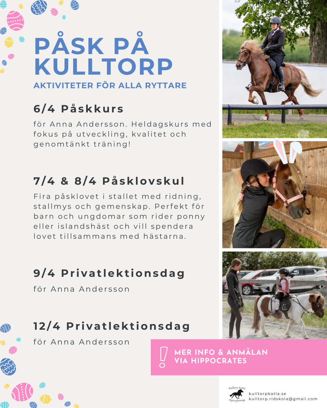Boka via Hippocrates Academy! Kontakta oss på kulltorp.ridskola@gmail.com vid frågor och hjälp med bokning.